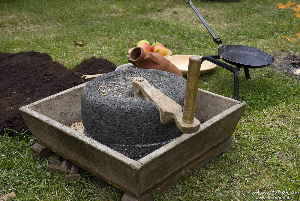 Nachbau eines römischen Feldlagers mit Feuer, zelt, Getreidemühle und Werkzeugen Hedemünden, Deutschland