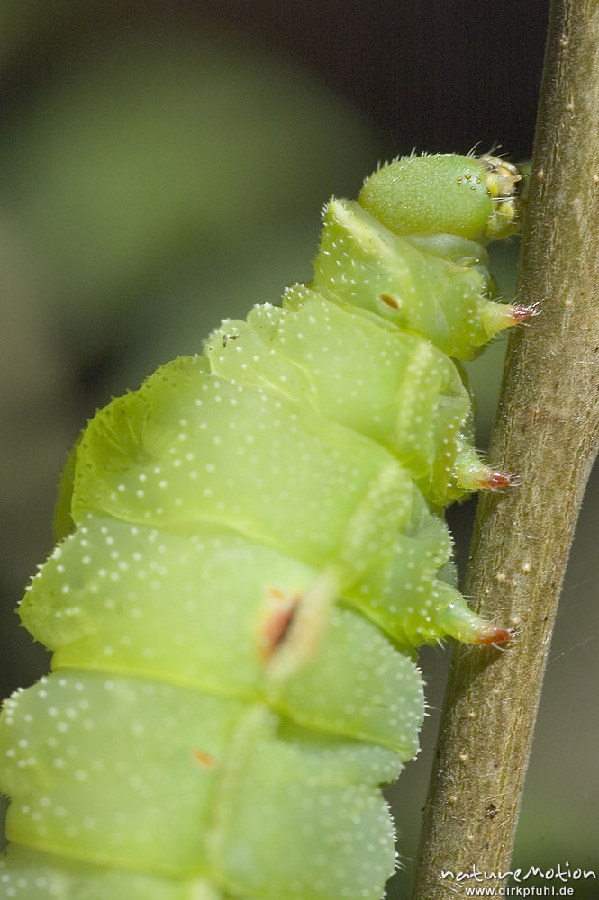 Nagelfleck, Aglia tau, Saturniidae, Kopf, Raupe an Zweig, Göttinger Wald, Göttingen, Deutschland