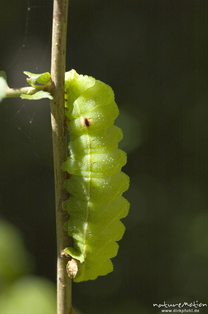 Nagelfleck, Aglia tau, Saturniidae, Raupe an Zweig, Göttinger Wald, Göttingen, Deutschland