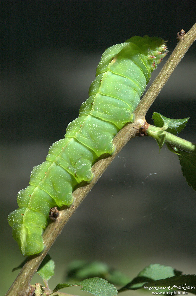 Nagelfleck, Aglia tau, Saturniidae, Raupe an Zweig, Göttinger Wald Göttingen, Deutschland