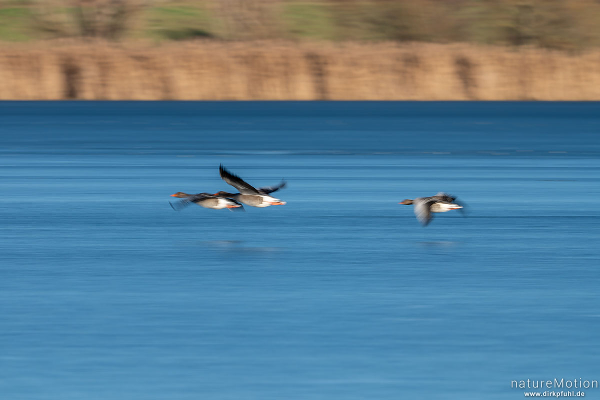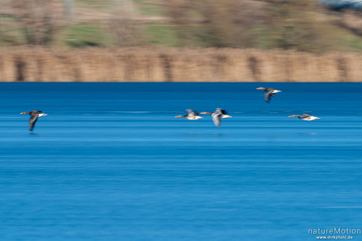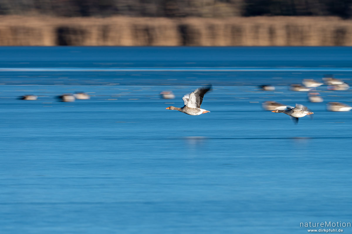 Graugans, Anser anser, Anatidae, fliegen über Eisfläche, ...