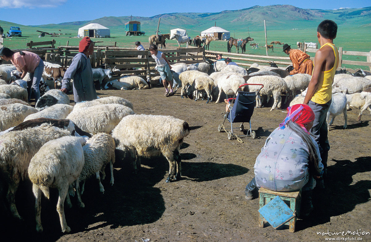 Nomaden beim Melken von Schafen in abgezäuntem Areal, Changai, Mongolei