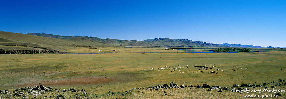 Nomadenlager in einer Flussschleife des Ulaan Gol, Ail mit mehreren Jurten (Ger), Viehherde Changai, Mongolei