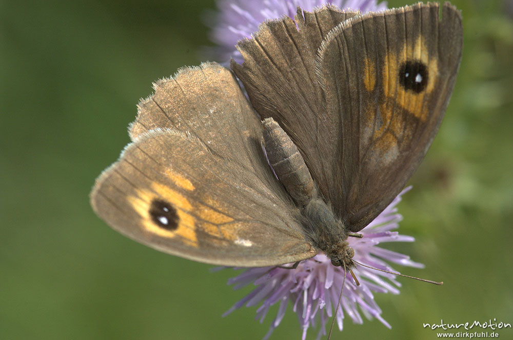 Ochsenauge, Maniola jurtina, Nymphalidae, auf Diestelblüte, Sengerfeld Göttingen, Deutschland