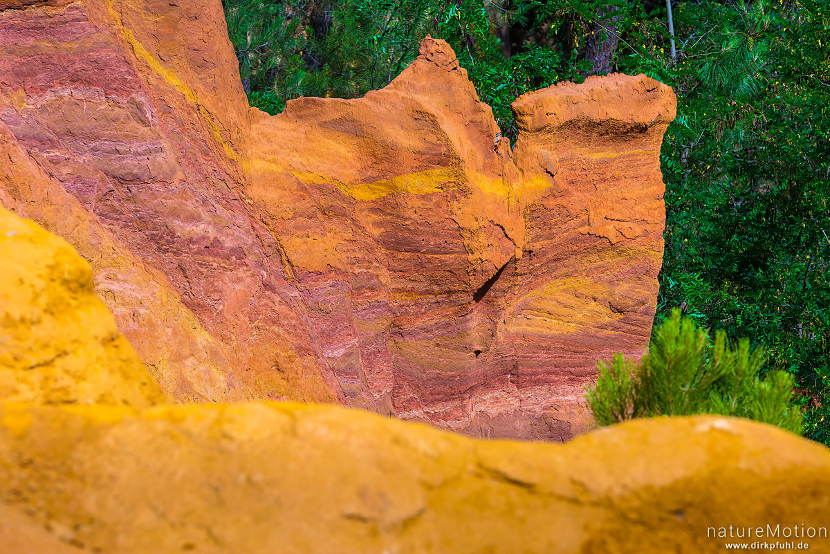 Ockersteinbruch, Felsen und Sand in verschiedenen Rot, Braun und Gelbtönen, dazwischen grüne Nadelbäume, Roussillon - Provence, Frankreich