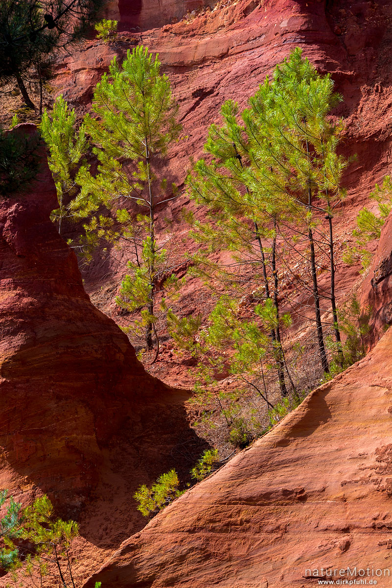 Ockersteinbruch, Felsen und Sand in verschiedenen Rot, Braun und Gelbtönen, dazwischen grüne Nadelbäume, Roussillon - Provence, Frankreich