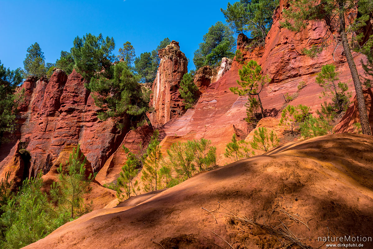 Ockersteinbruch, Felsen und Sand in verschiedenen Rot, Braun und Gelbtönen, dazwischen grüne Nadelbäume, Roussillon - Provence, Frankreich