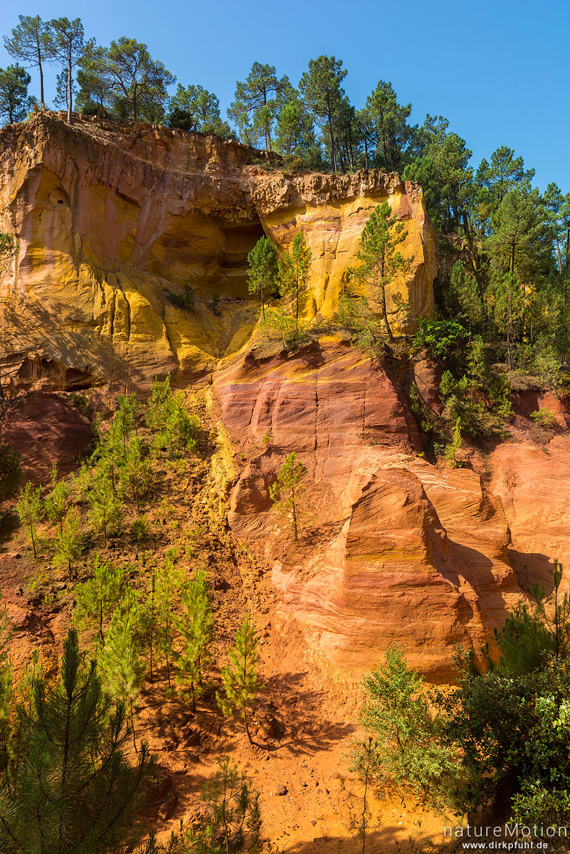 Ockersteinbruch, Felsen und Sand in verschiedenen Rot, Braun und Gelbtönen, dazwischen grüne Nadelbäume, Roussillon - Provence, Frankreich