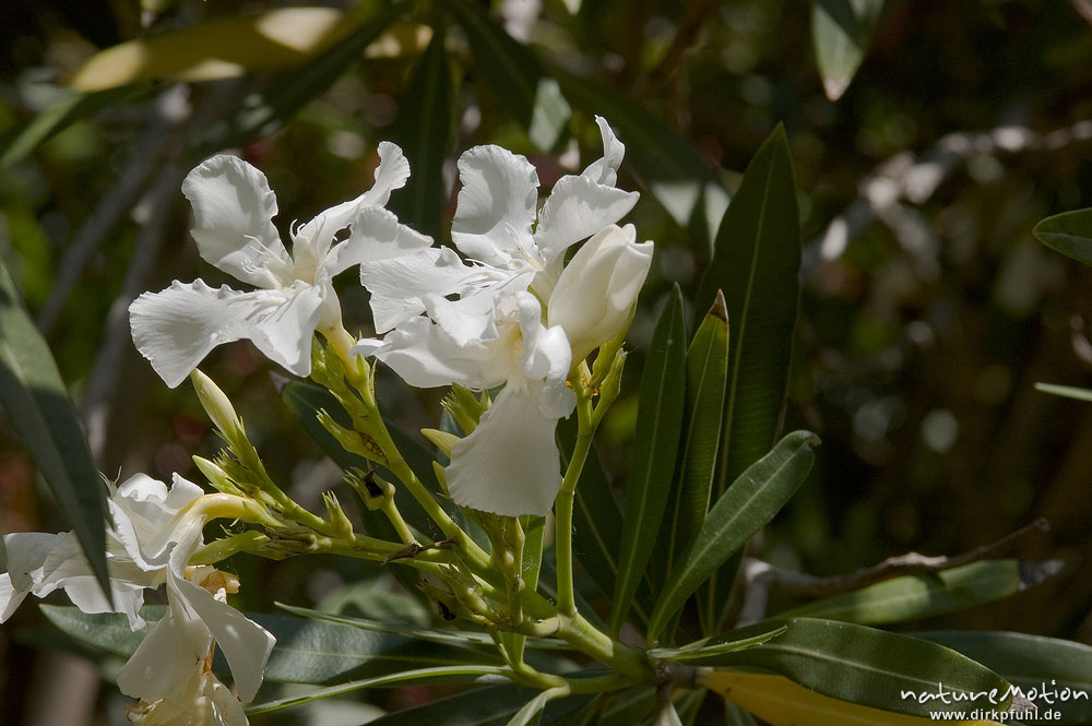 Oleander, Nerium oleander, Hundsgiftgewächse (Apocynaceae), weiß blühend, Blüten und Blätter, Campingplatz Asciaghjiu, Korsika, Frankreich