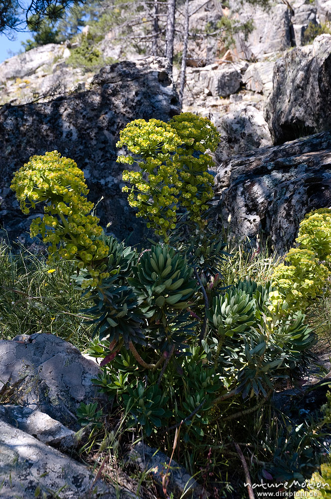 Palisaden-Wolfsmilch, Euphorbia characias, Wolfsmilchgewächse (Euphorbiaceae), Wegrand, Restonica-Ta, Korsika, Frankreich