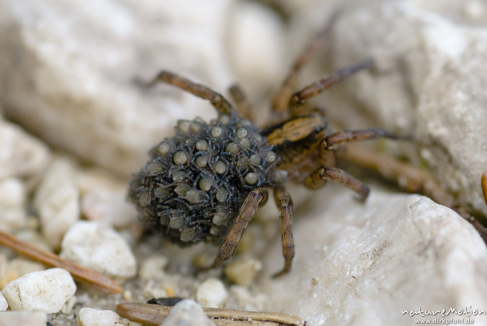 Pardosa miniata, Xerolycosa miniata, Wolfspinnen (Lycosidae), Weibchen, trägt Jungtiere auf dem Hinterleib, Bohinjer See Wocheiner See, Slowenien