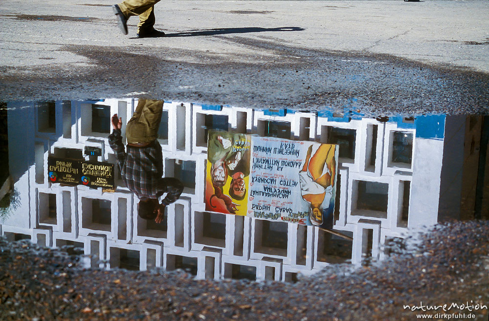 Pf?tze mit Spiegelung von Kinoreklame und Passant ,