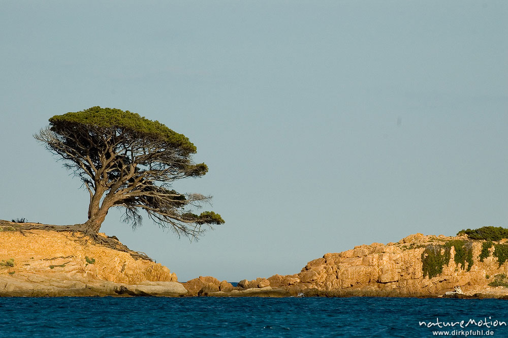 Pinie, Pinus pinea, Pinaceae, auf Felsspitze im Abendlicht, Bucht von Palombaggia "Pinu Acciaju" Korsika, Frankreich