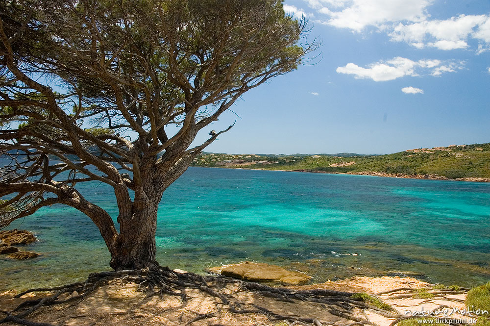 Pinie, Pinus pinea, Pinaceae, auf Felsspitze im Abendlicht, Bucht von Palombaggia "Pinu Acciaju" Korsika, Frankreich