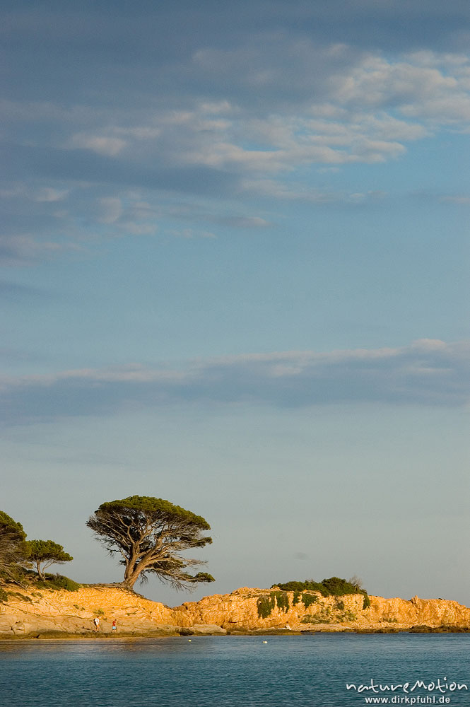 Pinie, Pinus pinea, Pinaceae, auf Felsspitze im Abendlicht, Bucht von Palombaggia "Pinu Acciaju" Korsika, Frankreich
