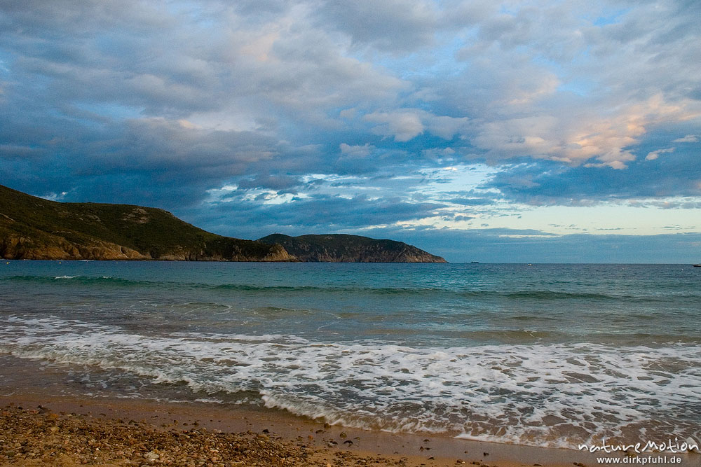 Plage d'Arone, Küstenlinie und Brandung im Abendlicht Korsika, Frankreich
