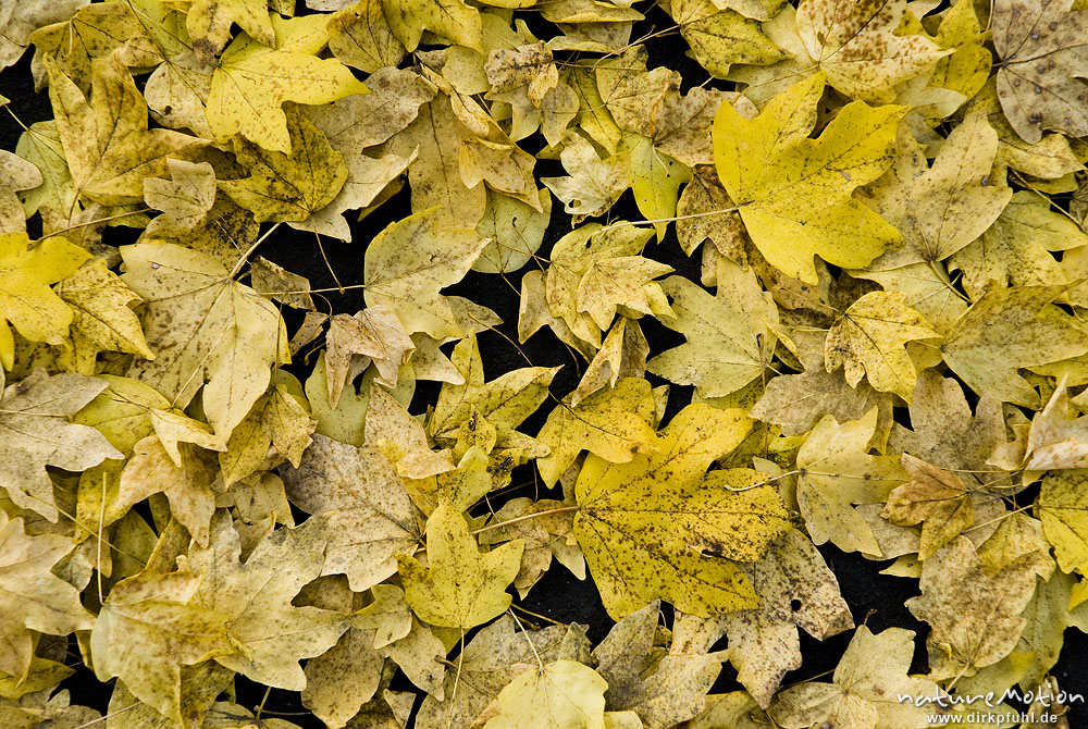 Platane, Platanus x hispanica, Platanaceae, gelbes Laub auf dem Boden Göttingen, Deutschland