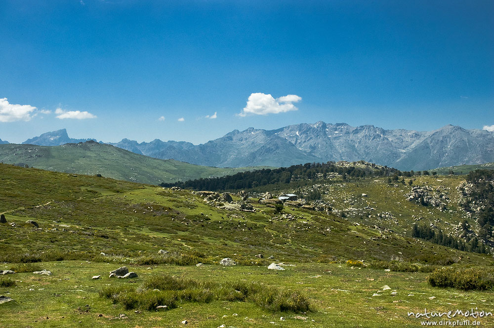 Plateau d'Alzo mit Bergerie de Colleta, Blick auf Paglia Orba und Massiv des Monte Cinto Korsika, Frankreich
