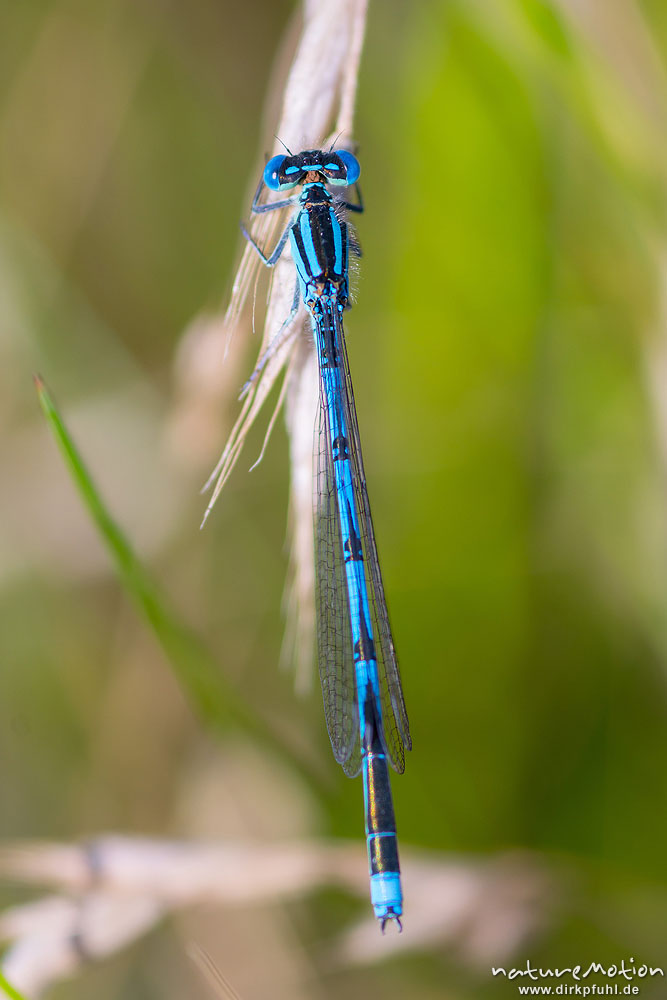 Pokal-Azurjungfer, Pokaljungfer, Erythromma lindenii, syn. Cercion lindenii, Schlanklibellen (Coenagrionidae),Männchen, sitzend an Grashalm, Wiese nahe Kiessee, A nature document - not arranged nor manipulated, Göttingen, Deutschland