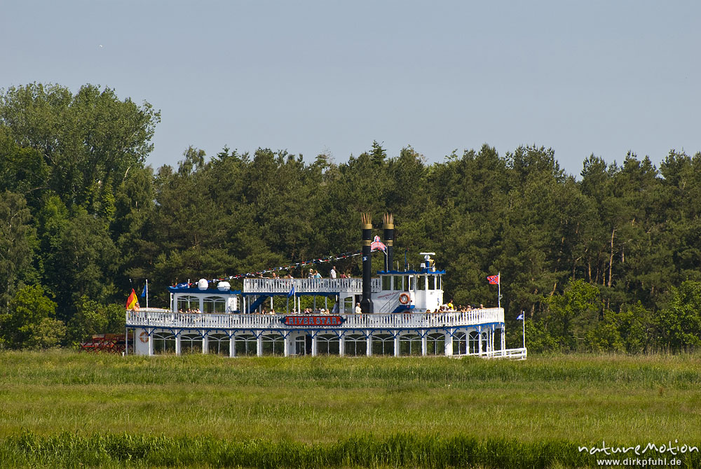 Raddampfer "Riverstar" auf dem Prerowstrom, Raddampfer fährt zwischen Wiesen Richtung Bodden, Prerow, Darß, Zingst, Deutschland