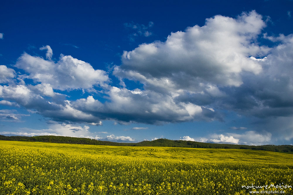 Rapsfeld, blühend, darüber Wolken an blauem Himmel Ballenhausen bei Göttingen, Deutschland