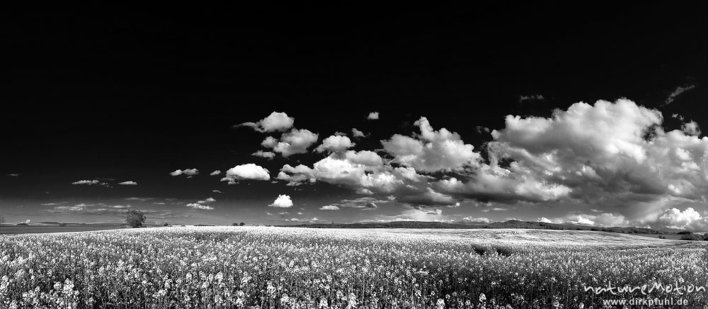 Rapsfeld, blühend, darüber Wolken an blauem Himmel, Ballenhausen bei Göttingen, Deutschland