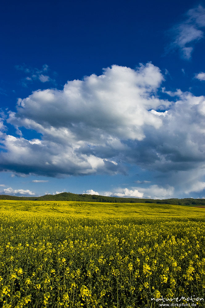 Rapsfeld, blühend, darüber Wolken an blauem Himmel, Ballenhausen bei Göttingen, Deutschland