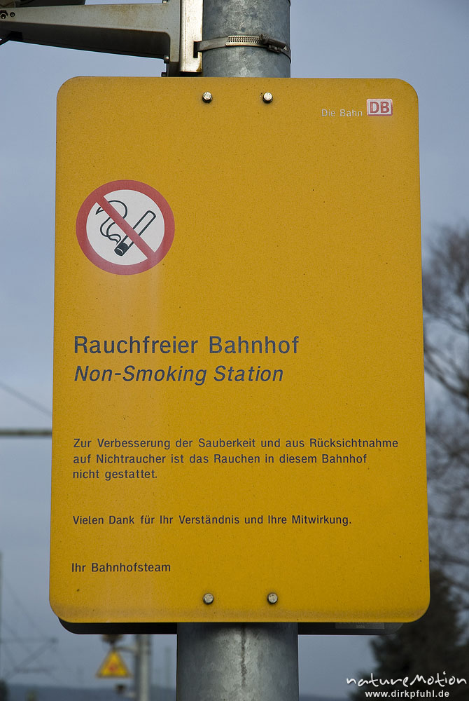 Rauchfreier Bahnhof, Schild am Bahnsteig, Bahnhof Friedland Friedland, Deutschland
