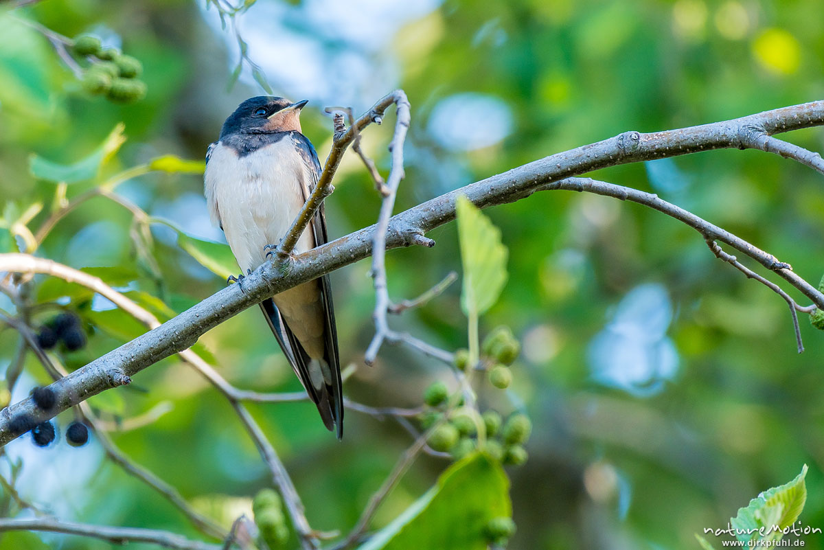 Rauchschwalbe, Hirundo rustica, Schwalben (Hirundinidae), Tiere rasten in Baum, Flütewehr, Göttingen, Deutschland