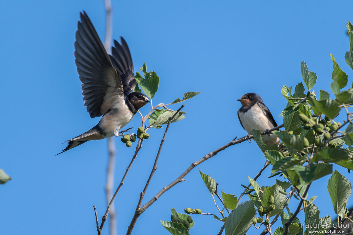 Rauchschwalbe, Hirundo rustica, Schwalben (Hirundinidae), Tiere sitzen im Geäst, Flüthewehr, Göttingen, Deutschland