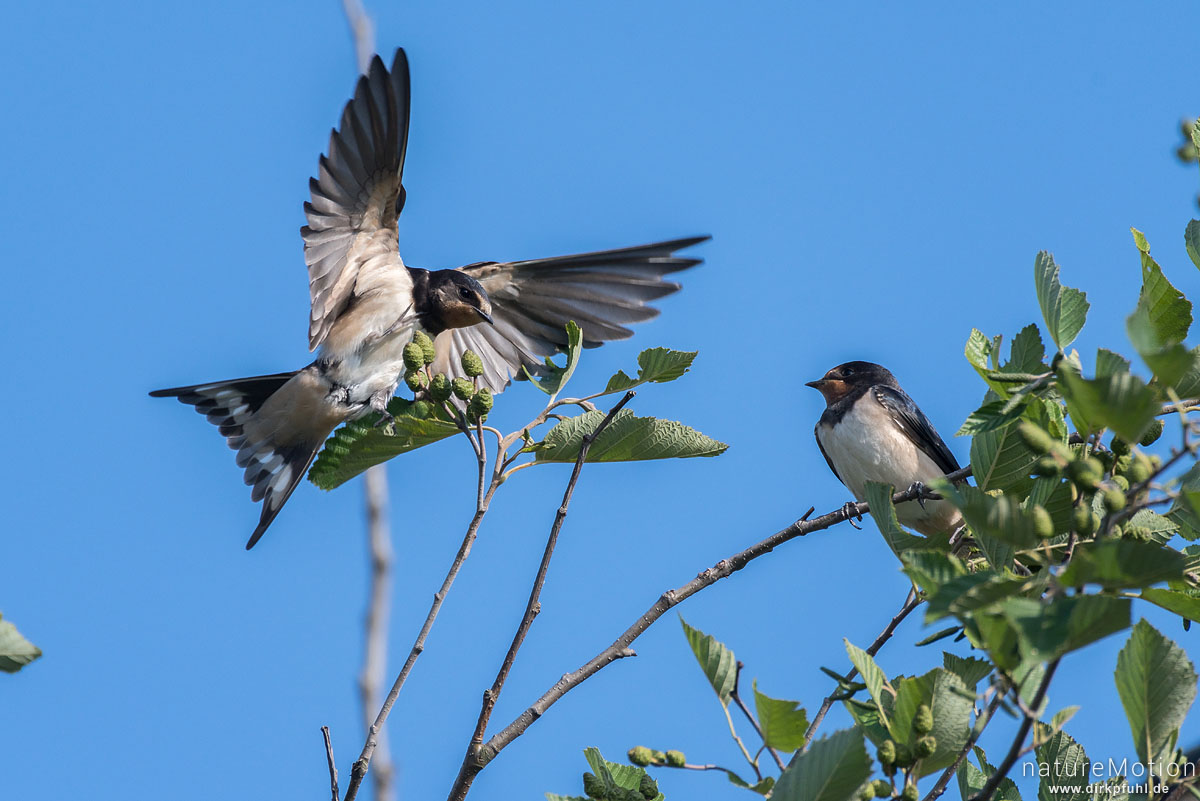 Rauchschwalbe, Hirundo rustica, Schwalben (Hirundinidae), Tiere sitzen im Geäst, Flüthewehr, Göttingen, Deutschland