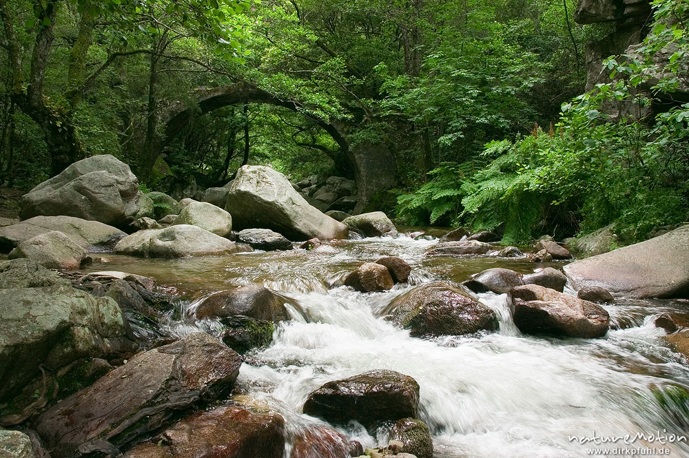 rauschender Bergbach, Ponte de Zaglia, Genuesenbrücke über den Spelunca-Bach, Gorche de Spelunca Korsika, Frankreich