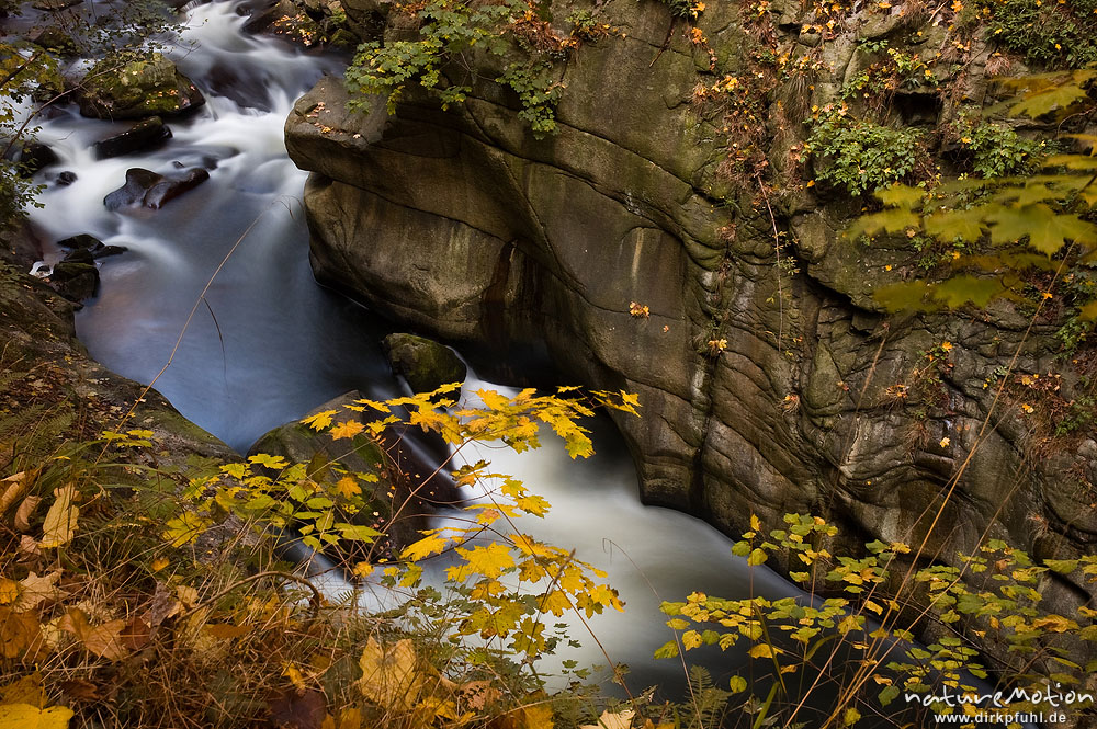 rauschender Bergbach und gelb gefärbte Ahornzweige, Bodetal, Deutschland