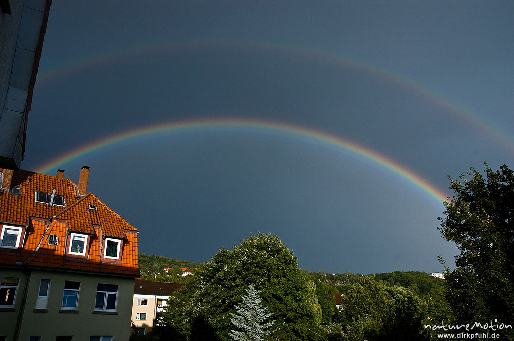 Regenbogen, doppelt, über Hausdach, Am Weißen Steine Göttingen, Deutschland