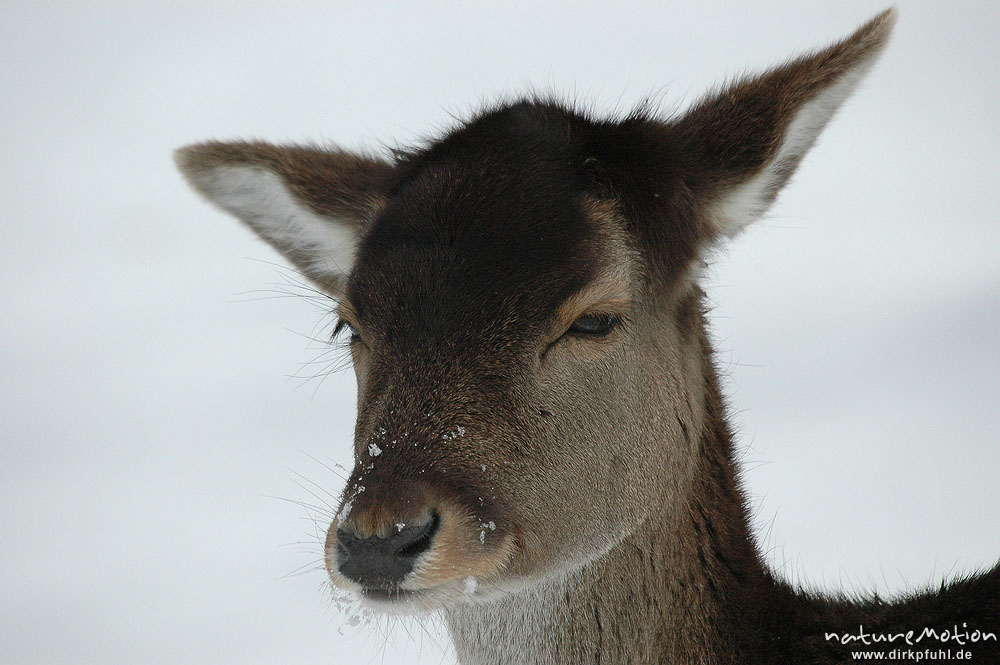 Reh, Capreolus capreolus, Cervidae, Gesicht mit Eiskristallen, Kehr, Göttingen, Deutschland