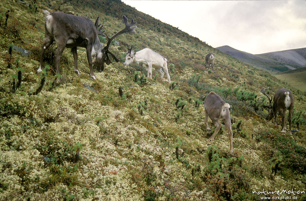 Rentier, Rangifer tarandus, Cervidae, Herde weidet Rentierflechten, Chowsgöl Nuur, Mongolei