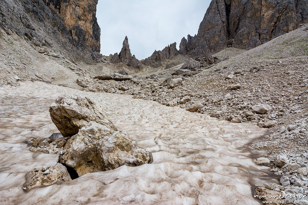 Restschnee und Wanderweg durch die Forc de la Neve, Candini di Misurina, Dolomiten, Italien