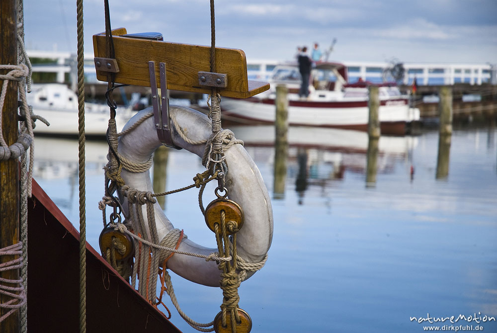 Rettungsring, Zeesenboote, Segelboote im Hafen von Wiek, Darß, Zingst, Deutschland