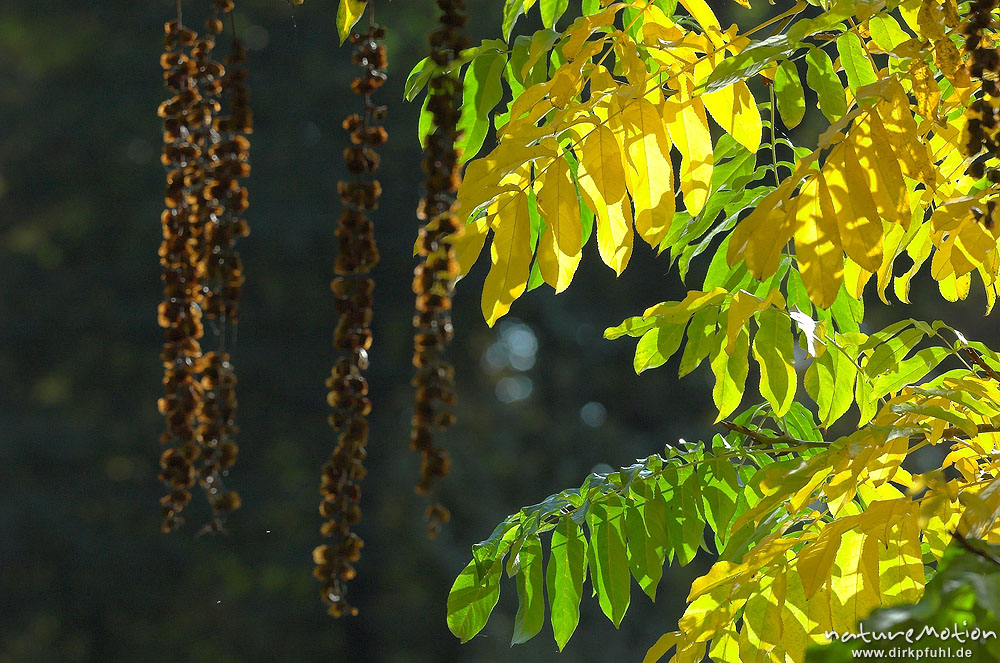 Robinie, Robinia pseudoacacia, Laub mit Herbstfärbung, Früchte, Teich im Sheltenham-Park Göttingen, Deutschland