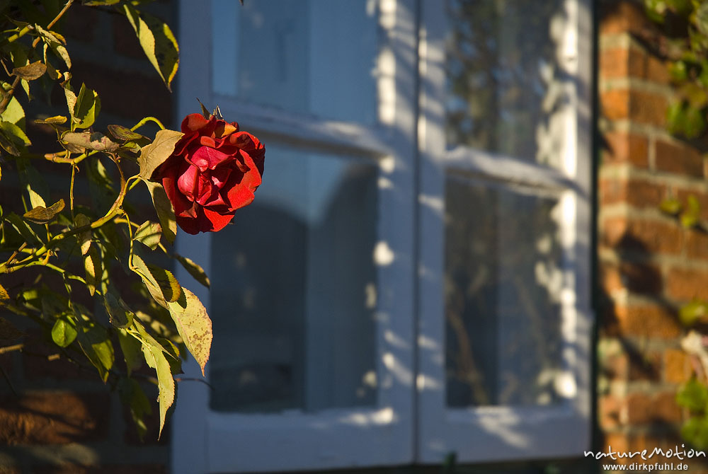 Rose, Fenster, umrahmt von Rosen, Backsteinhaus mit Reetdach, Nebel, Amrum, Deutschland