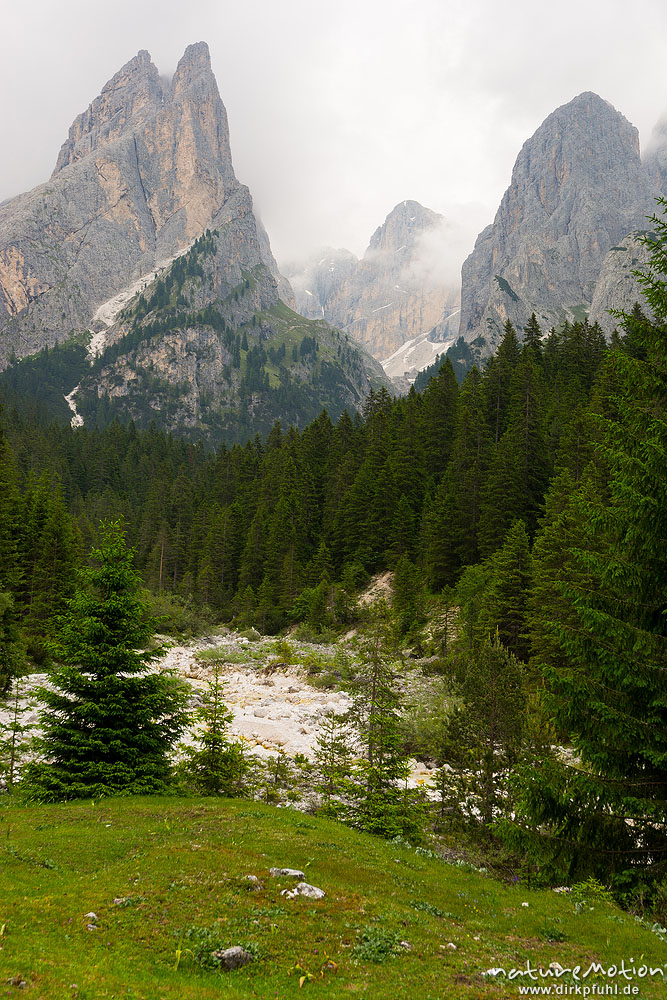 Rosengarten, Grasleitenspitzen, Valbon Kogel, Sattelspitze, Rosengartengruppe, Dolomiten, Blick vom Tschmintal, aufziehendes Gewitter, Völs am Schlern, Südtirol, Italien