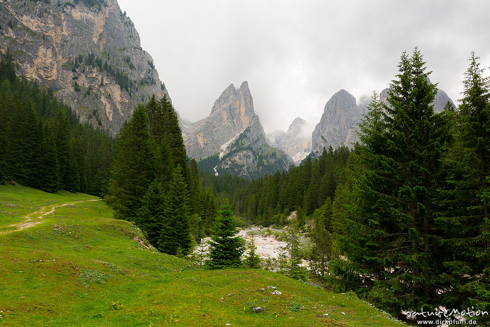 Rosengarten, Grasleitenspitzen, Valbon Kogel, Sattelspitze, Rosengartengruppe, Dolomiten, Blick vom Tschmintal, aufziehendes Gewitter, Völs am Schlern, Südtirol, Italien
