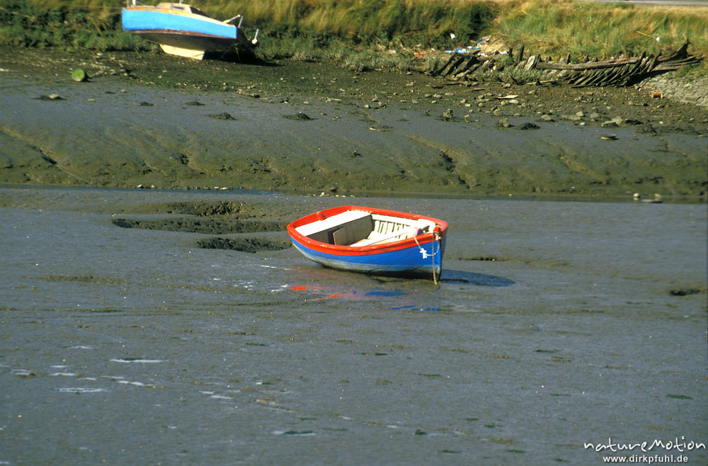 rot-blaues Ruderboot liegt auf trocken gefallenem Schlick im Hafenbecken, Bretagne, Frankreich