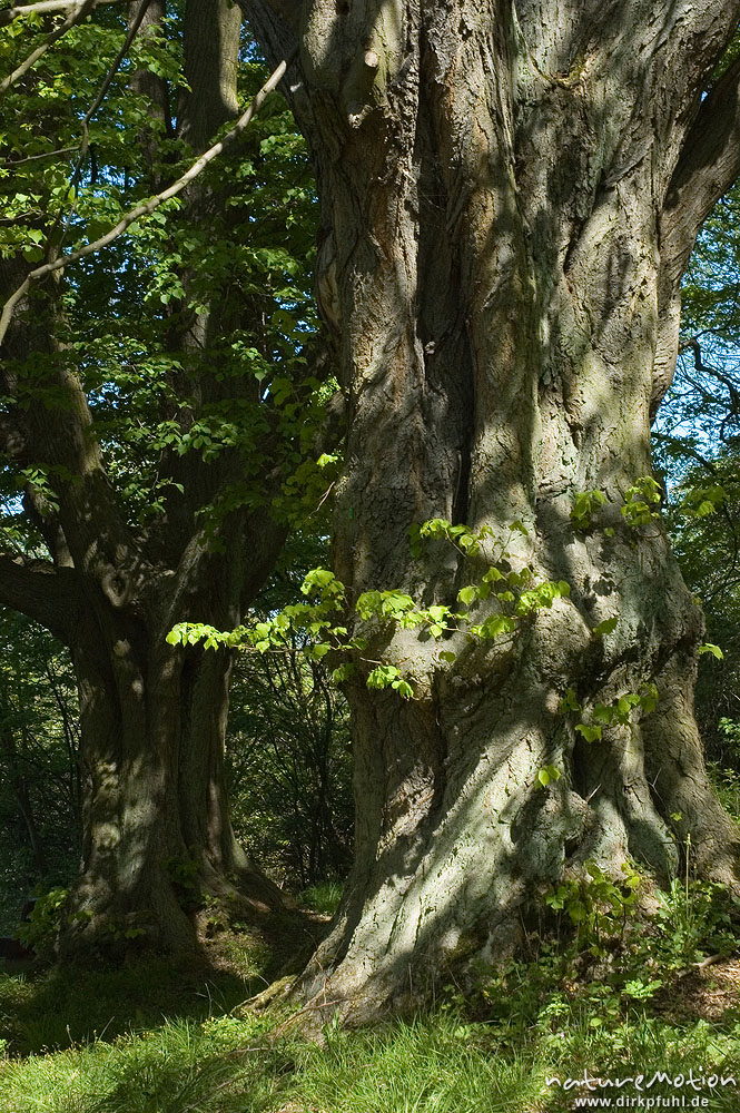 Rot-Buche, Fagus sylvatica, Fagaceae, alter Baum, ehemals freistehend, knotiger Stamm und Wurzelansatz, Drakenberg, Göttingen, Deutschland