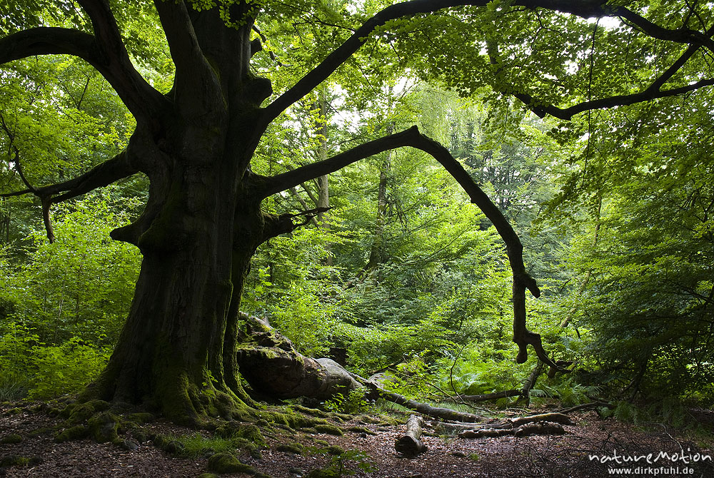 Rot-Buche, Fagus sylvatica, Fagaceae, alter Baum mit tief herabhängenden Ästen, Gegenlicht, Dunst, Urwald Sababurg, Deutschland