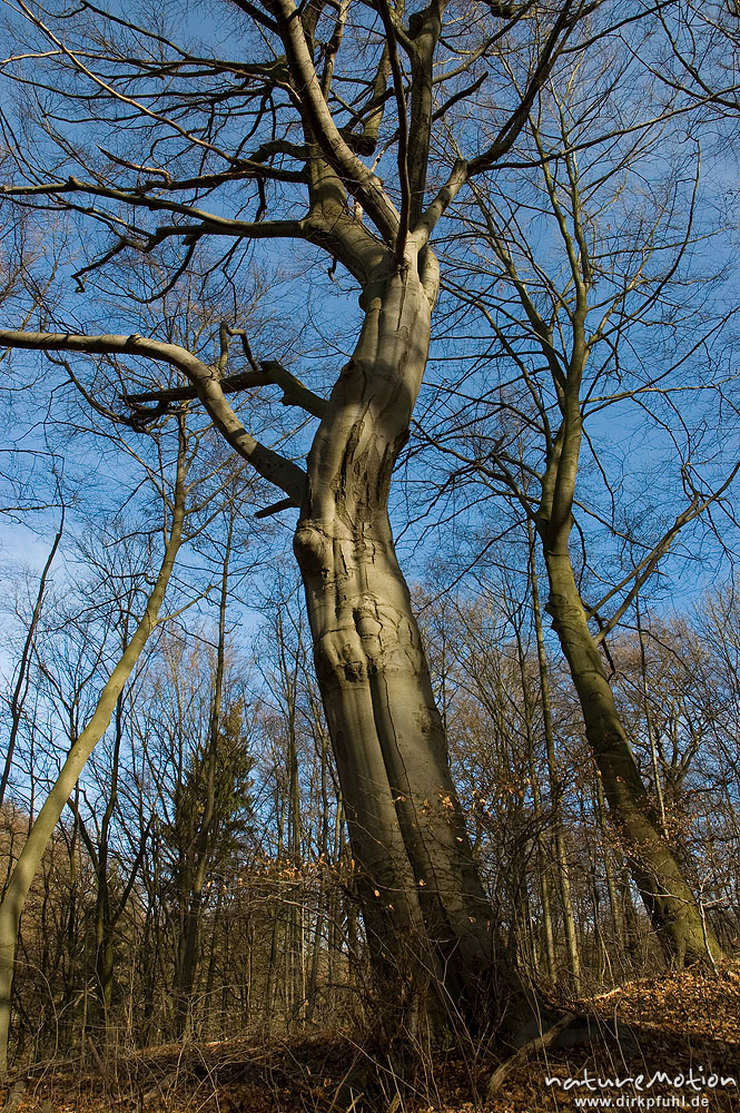 Rot-Buche, Fagus sylvatica, Fagaceae, Baum im Abendlicht vor blauem Himmel, Göttinger Wald, Göttingen, Deutschland