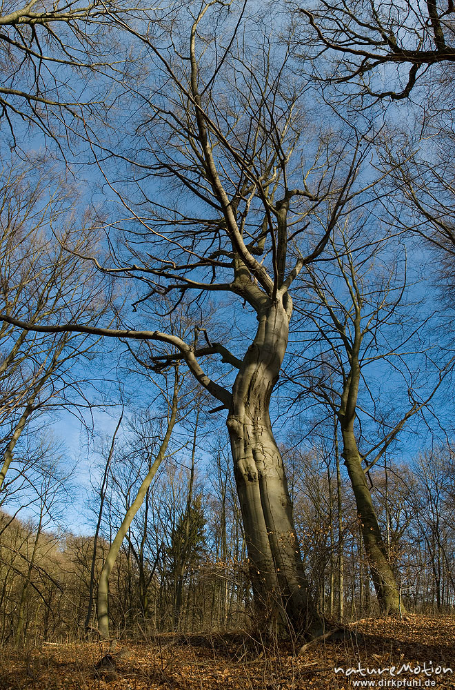 Rot-Buche, Fagus sylvatica, Fagaceae, Baum im Abendlicht vor blauem Himmel, Göttinger Wald, Göttingen, Deutschland