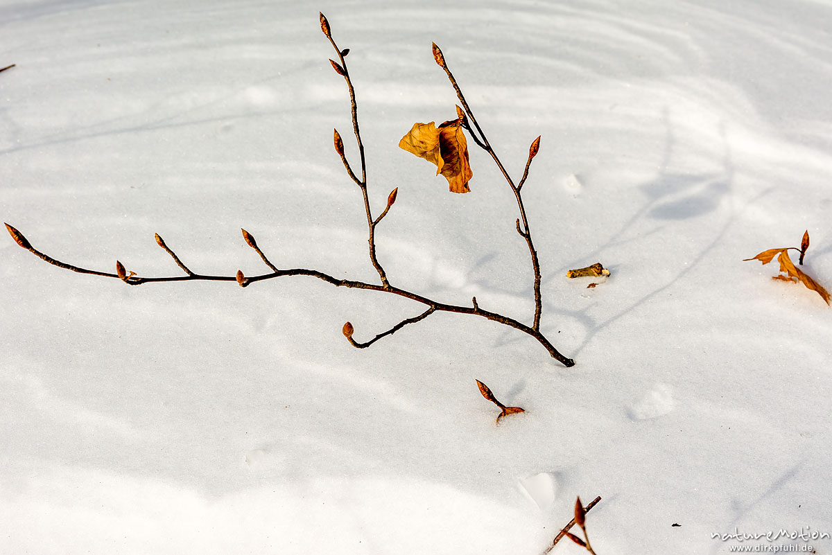 Rot-Buche, Fagus sylvatica, Fagaceae, Jungwuchs am Waldboden, Knospen an einem aus dem Schnee ragenden Zweig, Westerberg, Göttingen, Deutschland