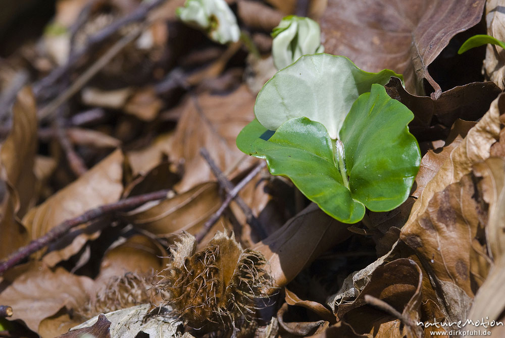 Rot-Buche, Fagus sylvatica, Fagaceae, Keimling, Schößling, Keimblätter, Laubstreu am Waldboden, Göttinger Wald, Göttingen, Deutschland