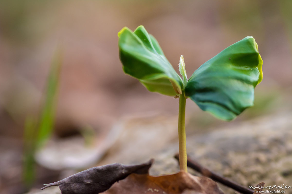 Rot-Buche, Fagus sylvatica, Fagaceae, Keimling, Spross, Schössling, frisch ausgetrieben mit zwei Keimblättern, Göttinger Wald, Göttingen, Deutschland